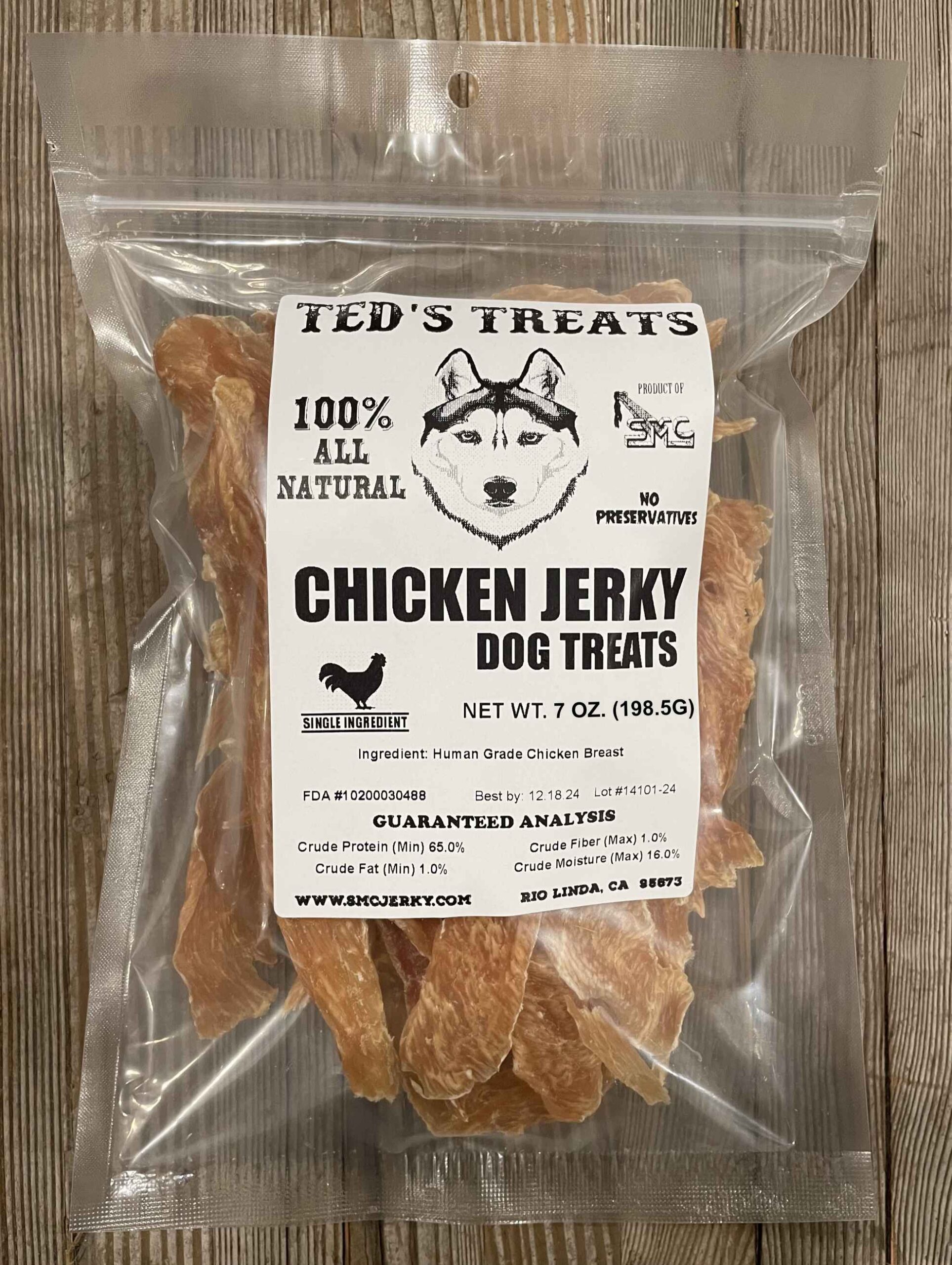 All Natural Chicken Jerky Dog Treats made with the same chicken breast that we process for people to eat. Only ingredient is chicken breast. There are NO Preservatives at all, including salt & glycerine.